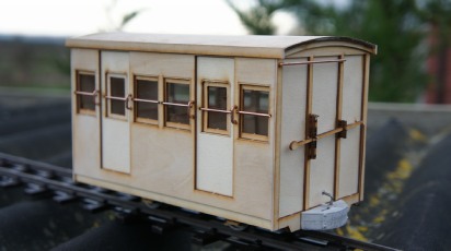 16 mm scale Darjeeling Coach No121 is the low roof 4 wheel 3rd class coach running in the 1950s The kit is as always ply construction with cast metal couplings brass wheel bearings and steel wheels the kit is complete all that is required is paint, glue and time. The model is available in either 32 mm gauge or 45 mm gauge please state when ordering. Note kit is supplied with the prototypical double buffer design but single buffers can be fitted if desired